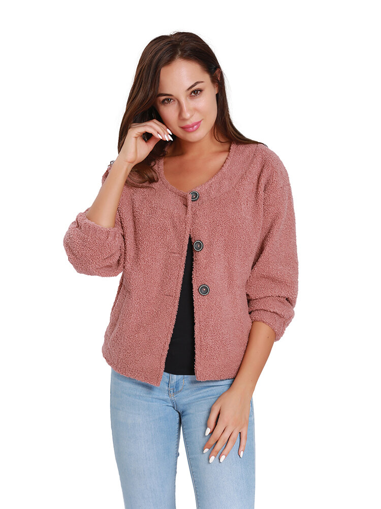 Casacos de manga longa de botão de lã de cor sólida de mulheres casuais