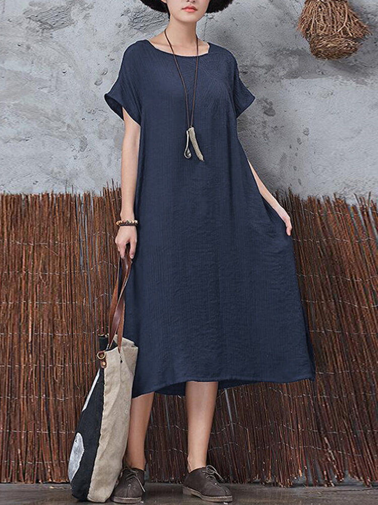 Casual Mulheres Vintage Bolsos De Manga Curta Vestido COD