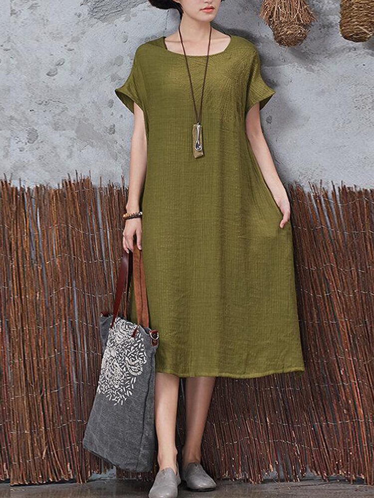 Casual Mulheres Vintage Bolsos De Manga Curta Vestido