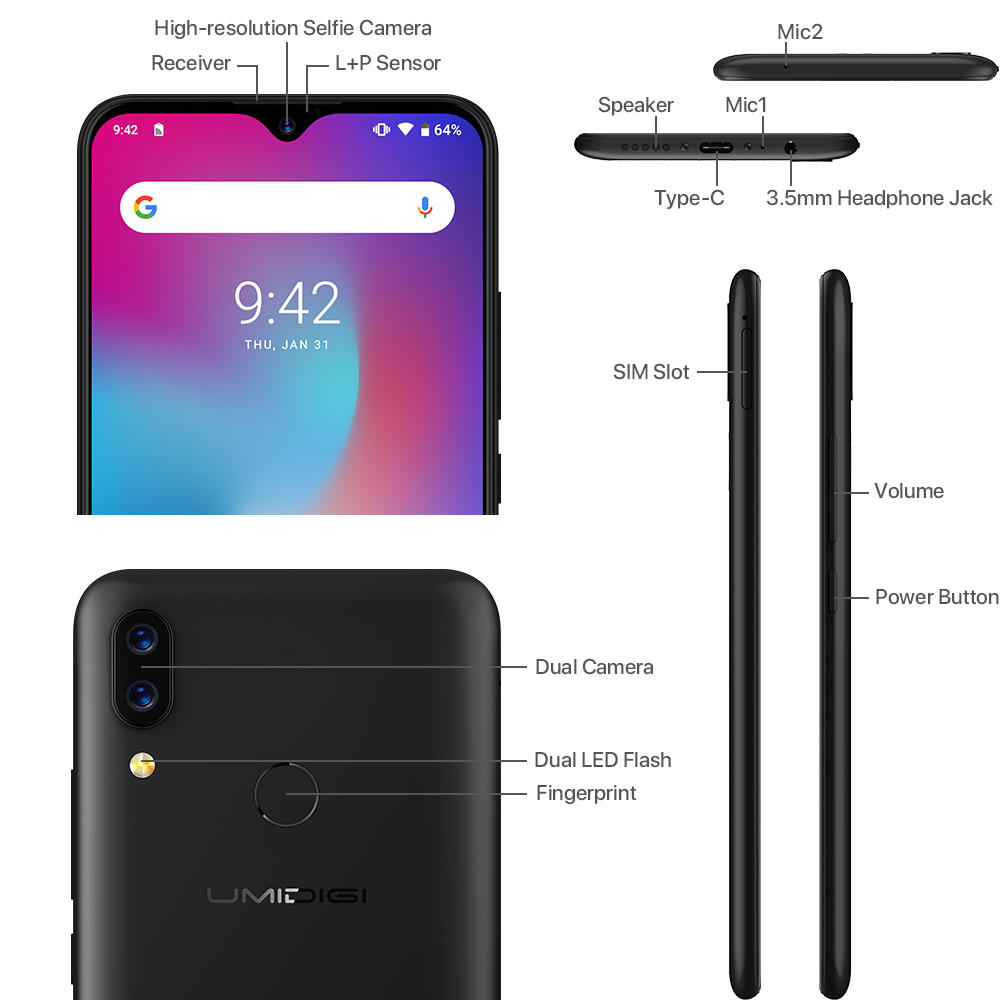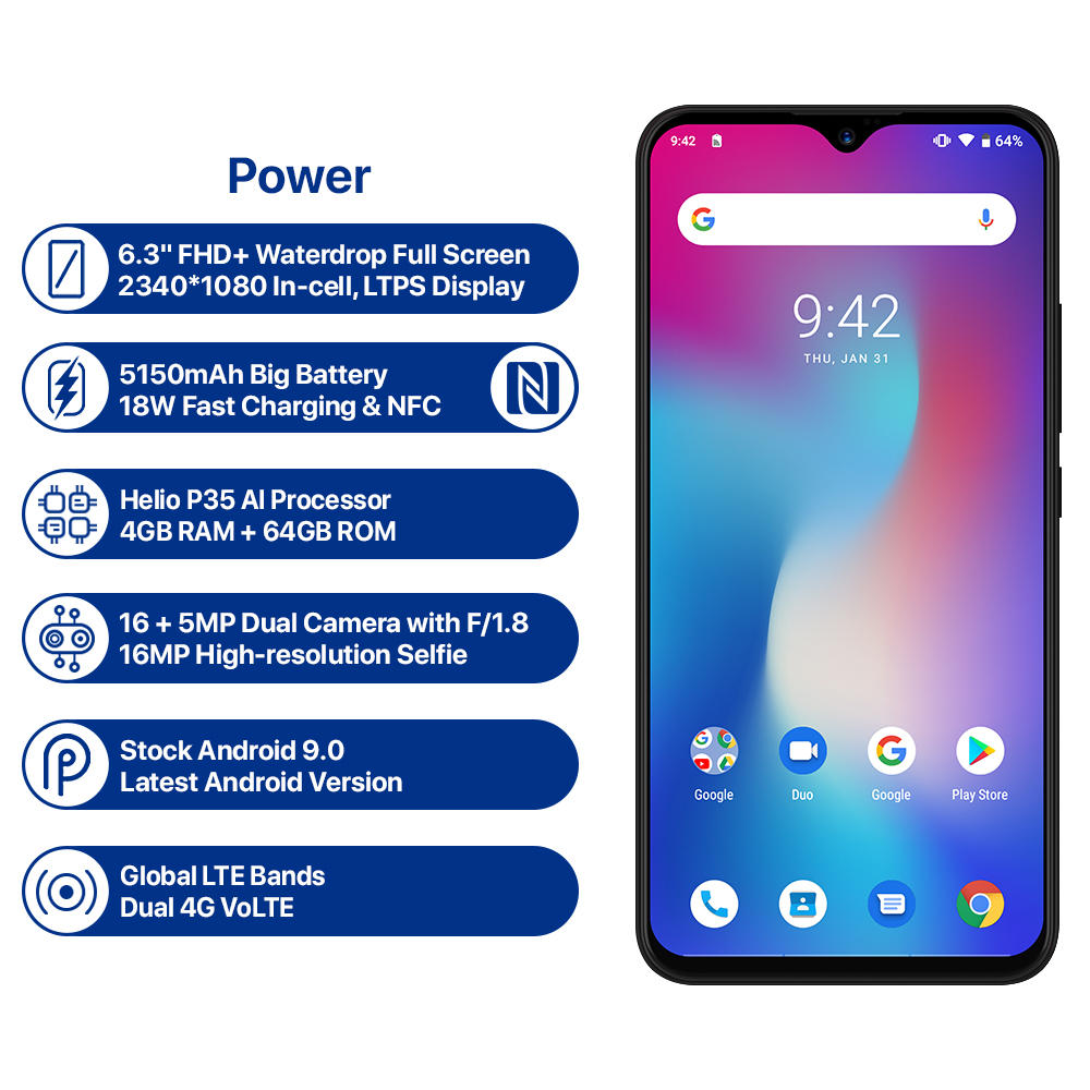 • UMIDIGI Poder Global Bandas de 6.3 Polegada FHD + Waterdrop Display NFC 5150 mAh Android 9.0 4G 64G Hélio P35 4G Smartphone