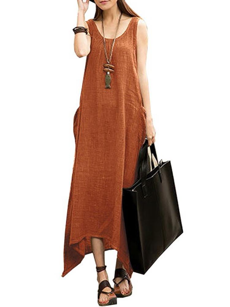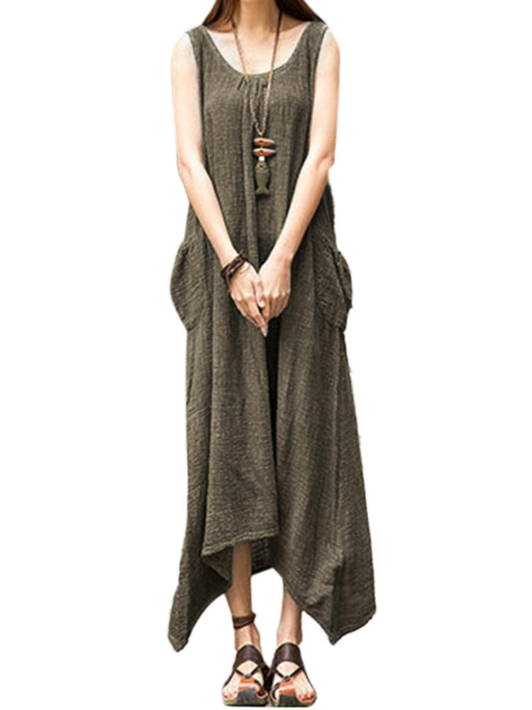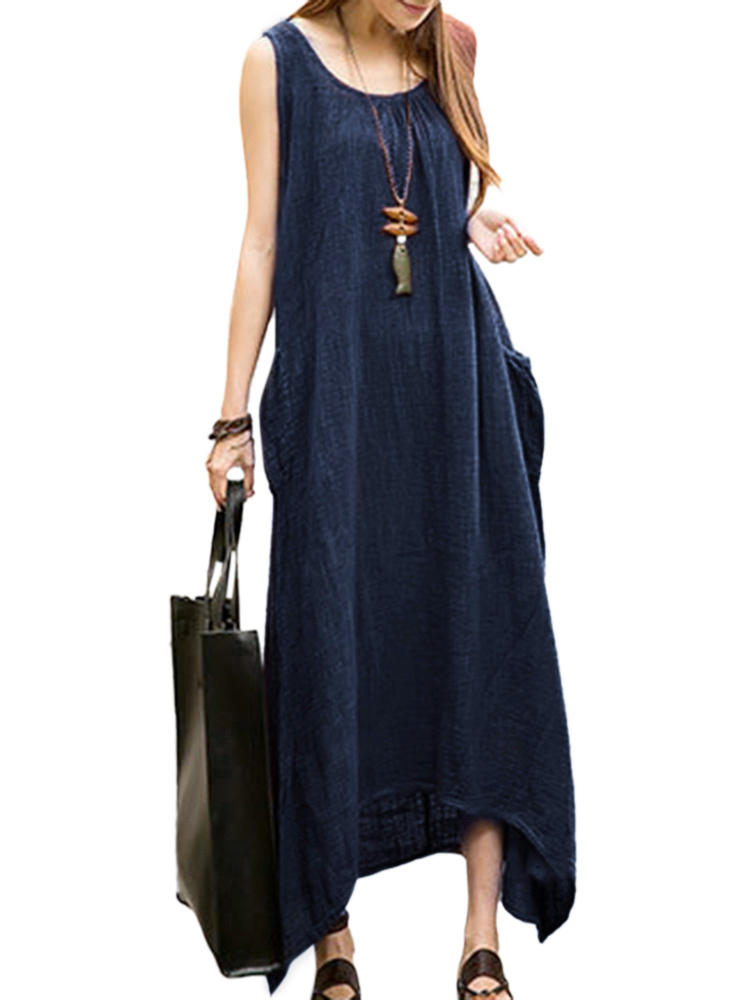 Vintage Casual Mulheres sem mangas High Low Cotton Maxi Dress