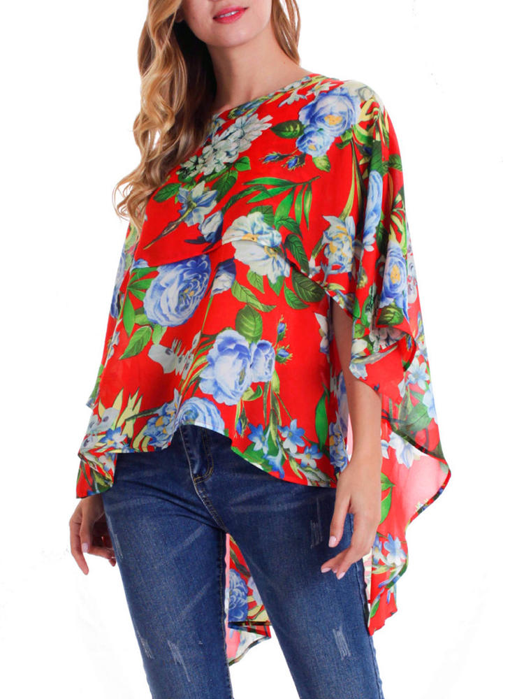 Women O-neck Floral Print Batting Sleeve Irregular Blouse